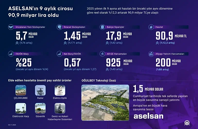 ASELSAN’ın 2025 yılı 9 aylık cirosu geçen yılın aynı dönemine göre reel olarak yüzde 12,3 büyüyerek 90,9 milyar liraya ulaştı. Söz konusu dönemde elde edilen hasılatta ÇELİKKUBBE, Radar, Elektro-Optik, Elektronik Harp, Güvenlik, Deniz ve Askeri Haberleşme Sistemlerine yönelik teslimatlar önemli pay oluşturdu.