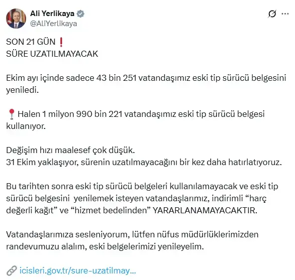 “Son 21 gün! Süre uzatılmayacak” başlığıyla bir açıklama yapan Bakan Yerlikaya, ekim ayı içinde sadece 43 bin 251 vatandaşımızın eski tip sürücü belgesini yenilediğini duyurdu.