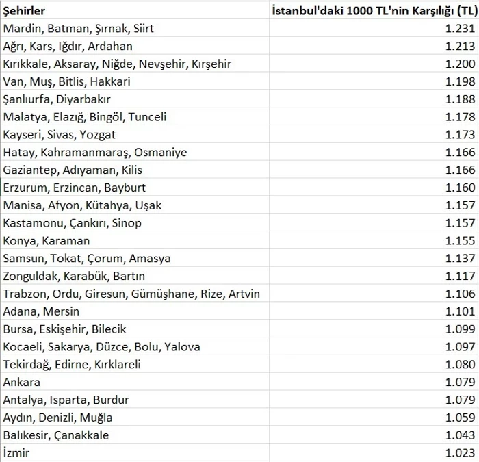 İstanbul’da 1.000 TL’nin satın alma gücü, Mardin, Batman, Şırnak ve Siirt gibi illerinde 1.231 TL’ye kadar çıkıyor. İstanbul’da 1.000 TL’nin diğer şehirlerdeki karşılığını gösteren detaylı bir tabloya aşağıdaki görselden ulaşabilirsiniz:
